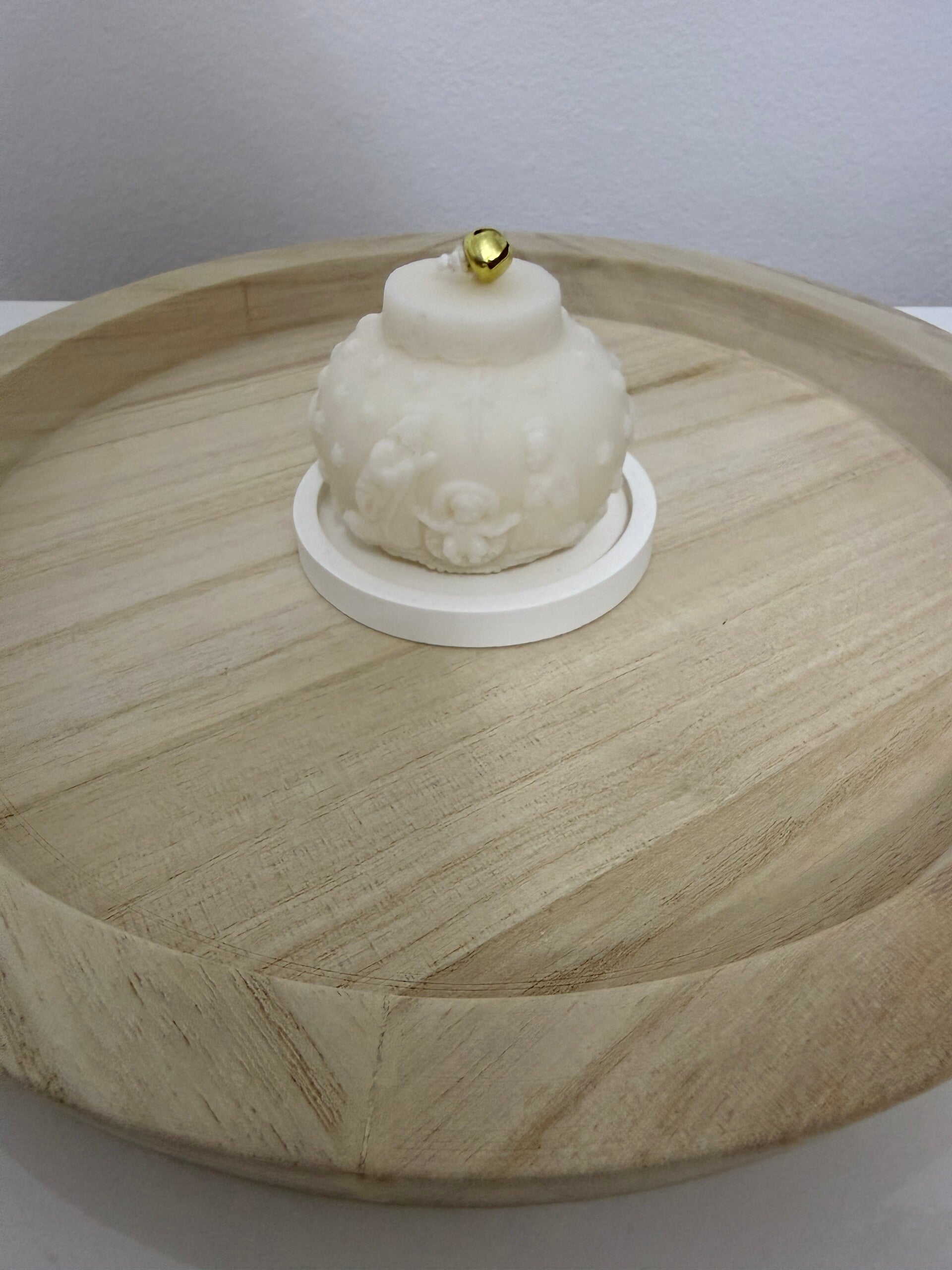 Candela Pallina Natalizia con Presepe in cera di oliva con elegante piattino con bordo squadrato.