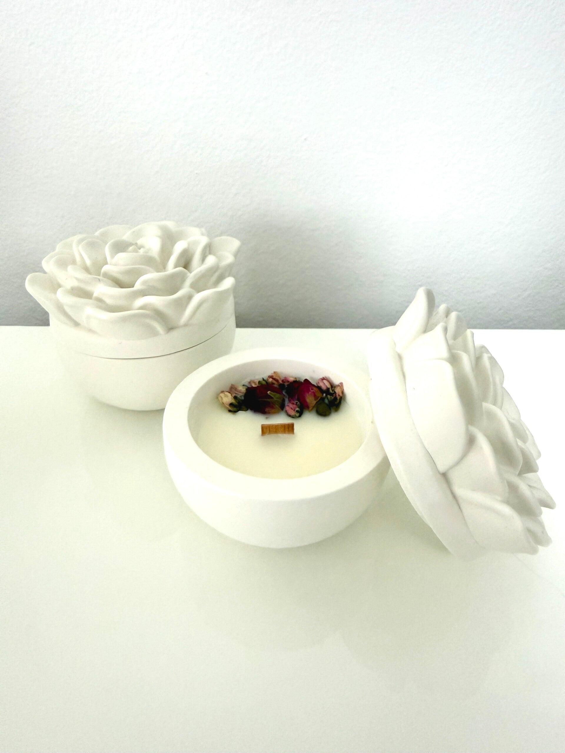 Candela botanica in cera di soia profumata con fragranza e arricchita da eleganti fiori e frutta essiccata.